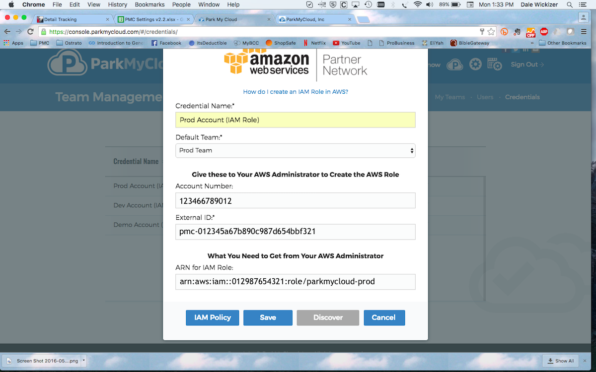 He then uses the AWS account number provided and external ID generated to get an ARN string from his administrator. Once that information is entered, he saves the credential.