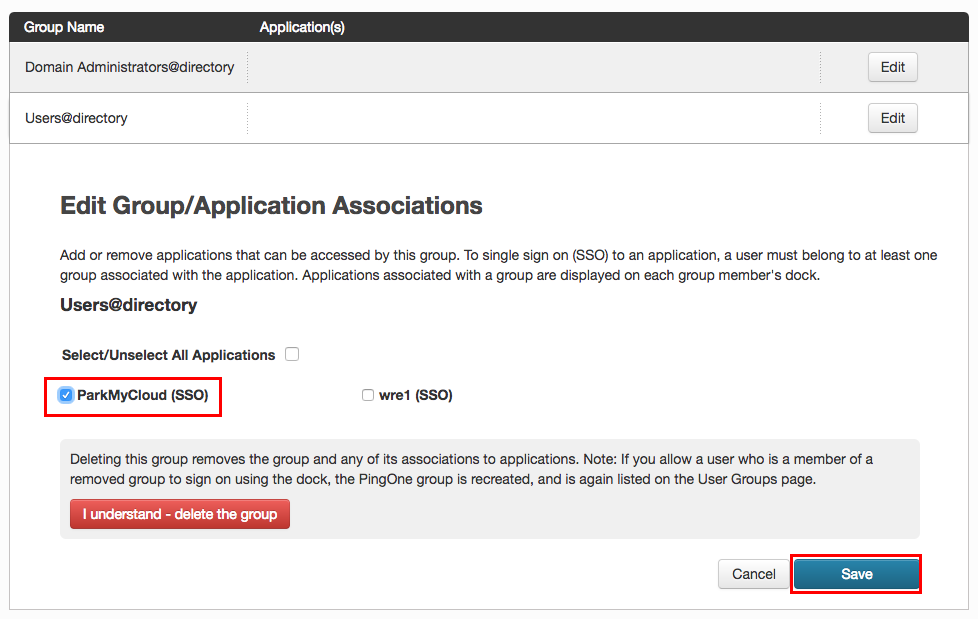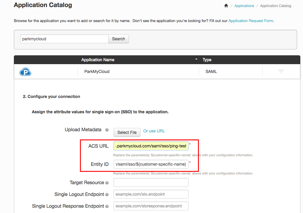 Keep this window open, as you will be needing some of the information shown in the box at the bottom of this screen - this is the Service Provider or SP configuration information, and is different for every ParkMyCloud customer. Note that these entries are rather long and potentially cryptic. The User Login URL is the address your ParkMyCloud users with use to login to ParkMyCloud when using SSO. You can customize this address by clicking the Change link at the bottom of the screen. This can let you change the coded part of the link to your company name or some other preferred string. If you think you will want to customize this string, do it now before proceeding to the steps below, as these strings will become part of the SSO integration config.